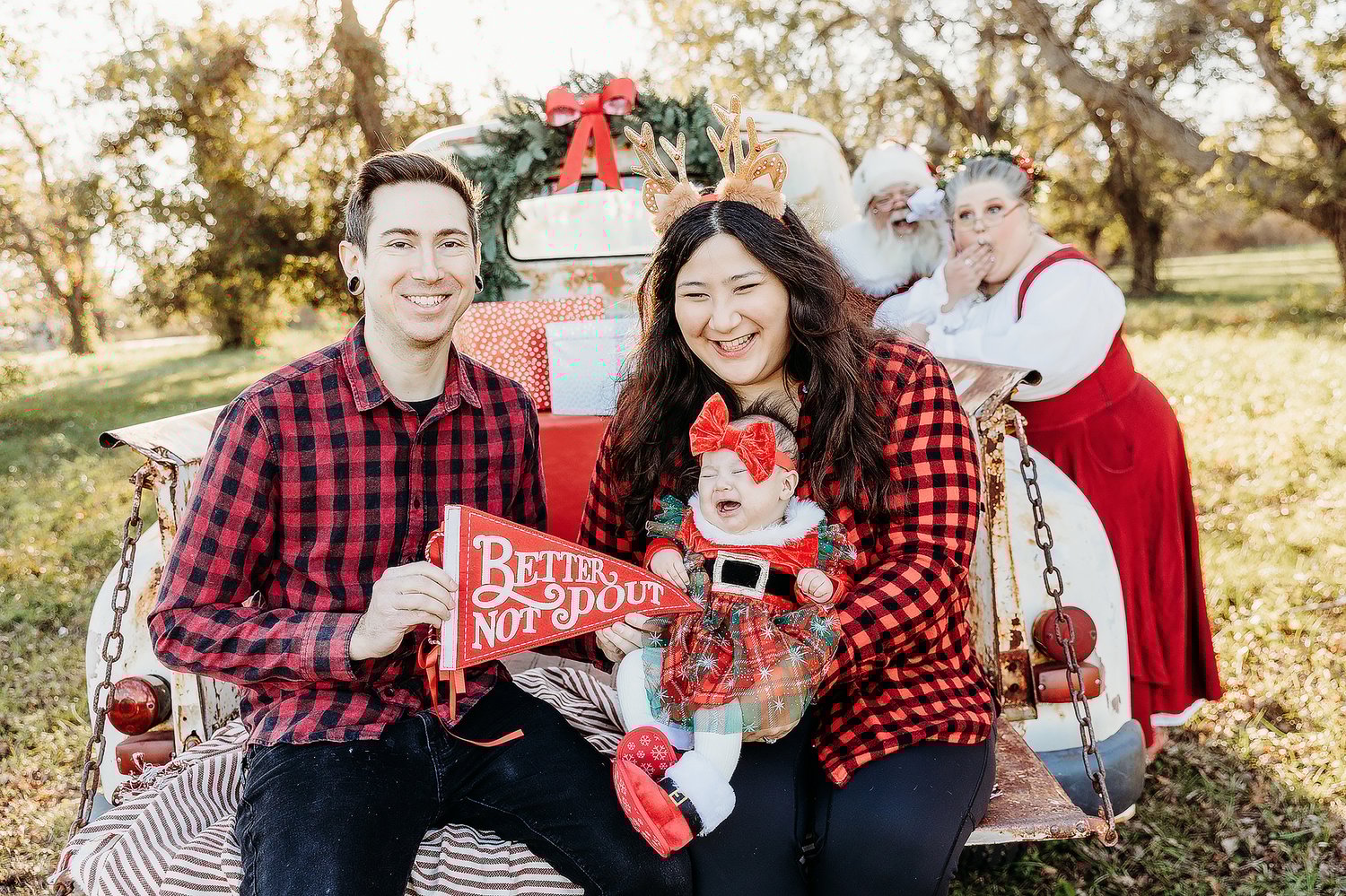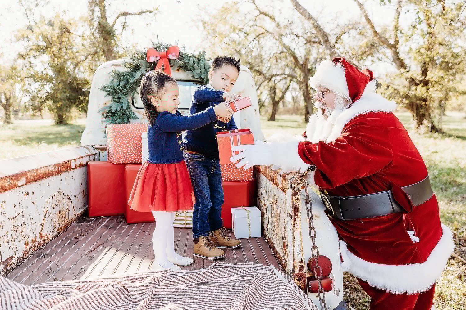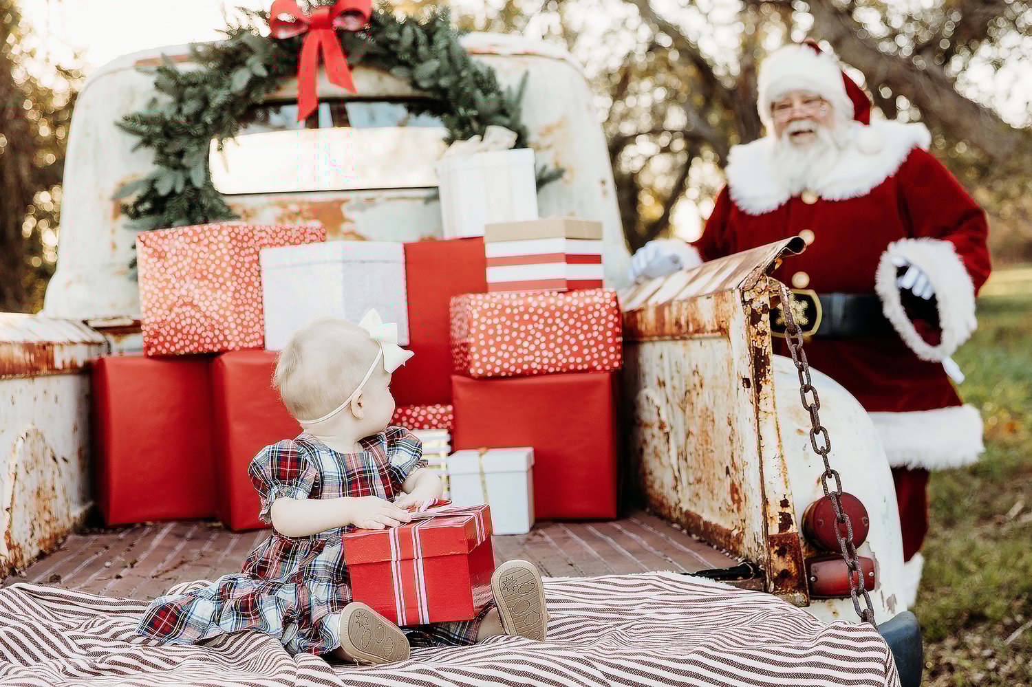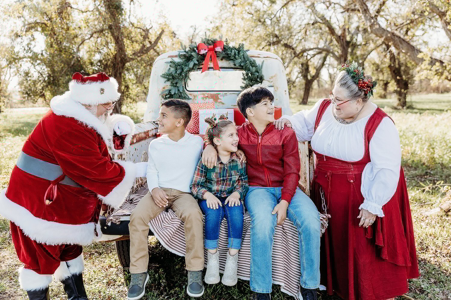 Create a picture perfect memory and hang out in the back of a vintage WHITE pick up truck with SANTA. The Christmas décor will be traditional Christmas colors. The set up with not be exactly as pictured, as we will have some Christmas trees added in this year.